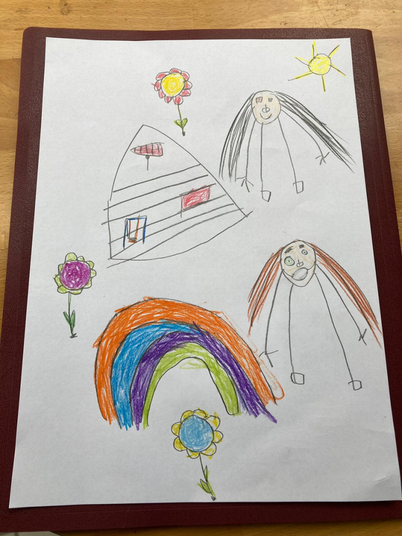 Da E. (6 J.) auf die Fragen der Schülerassistenz nicht mit Worten antwortete, hat das Schulkind ein Bild gemalt. Dargestellt ist die Schülerassistenz, E. und der Schulhof. Die Blumen, der Regenbogen und die Sonne, könnten als gute Stimmung zwischen den Beiden interpretiert werden.